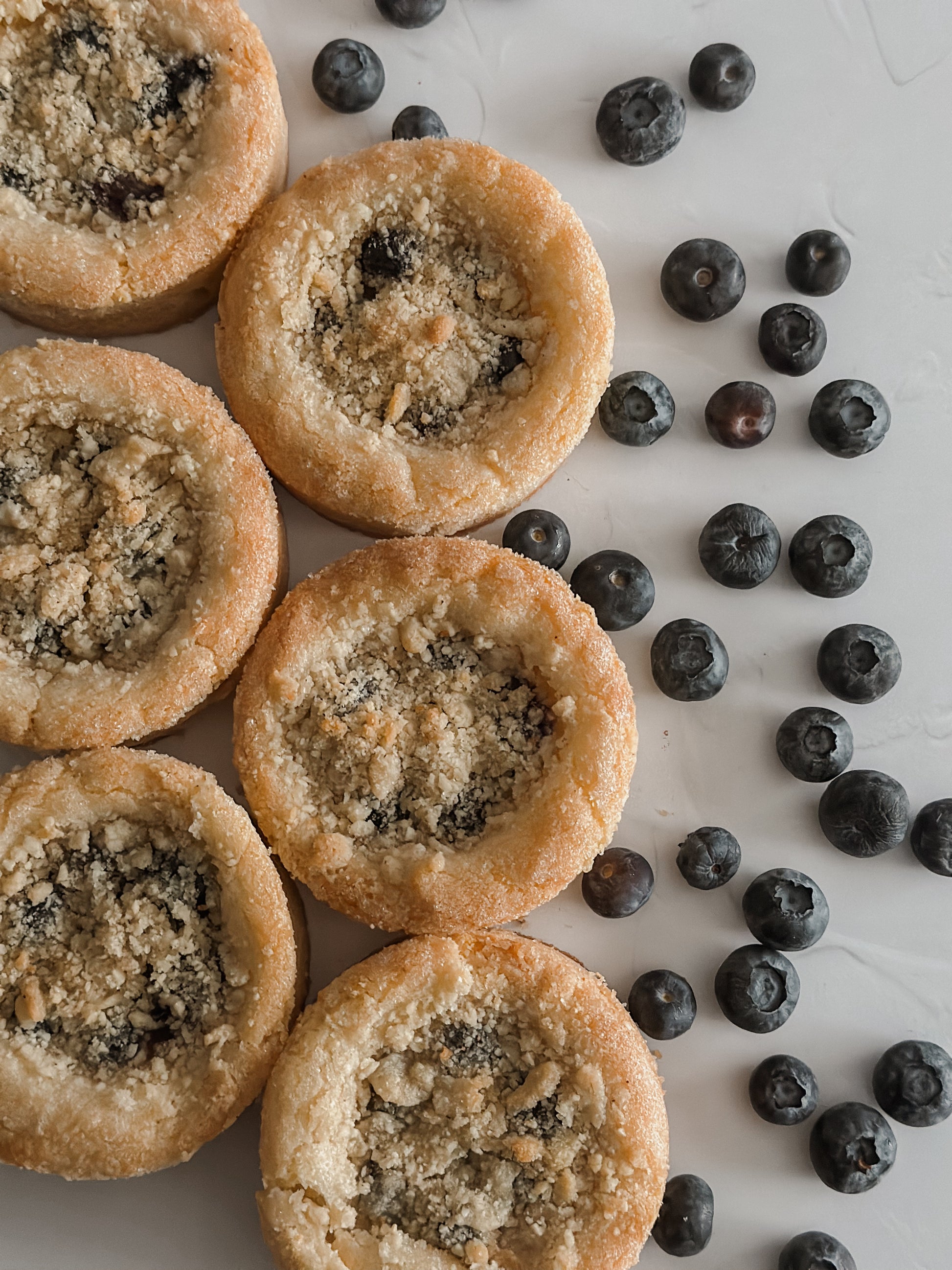 Un cookie à base d'une pâte à la vanille, d'un cœur aux myrtille et d'un crumble aux amandes.
