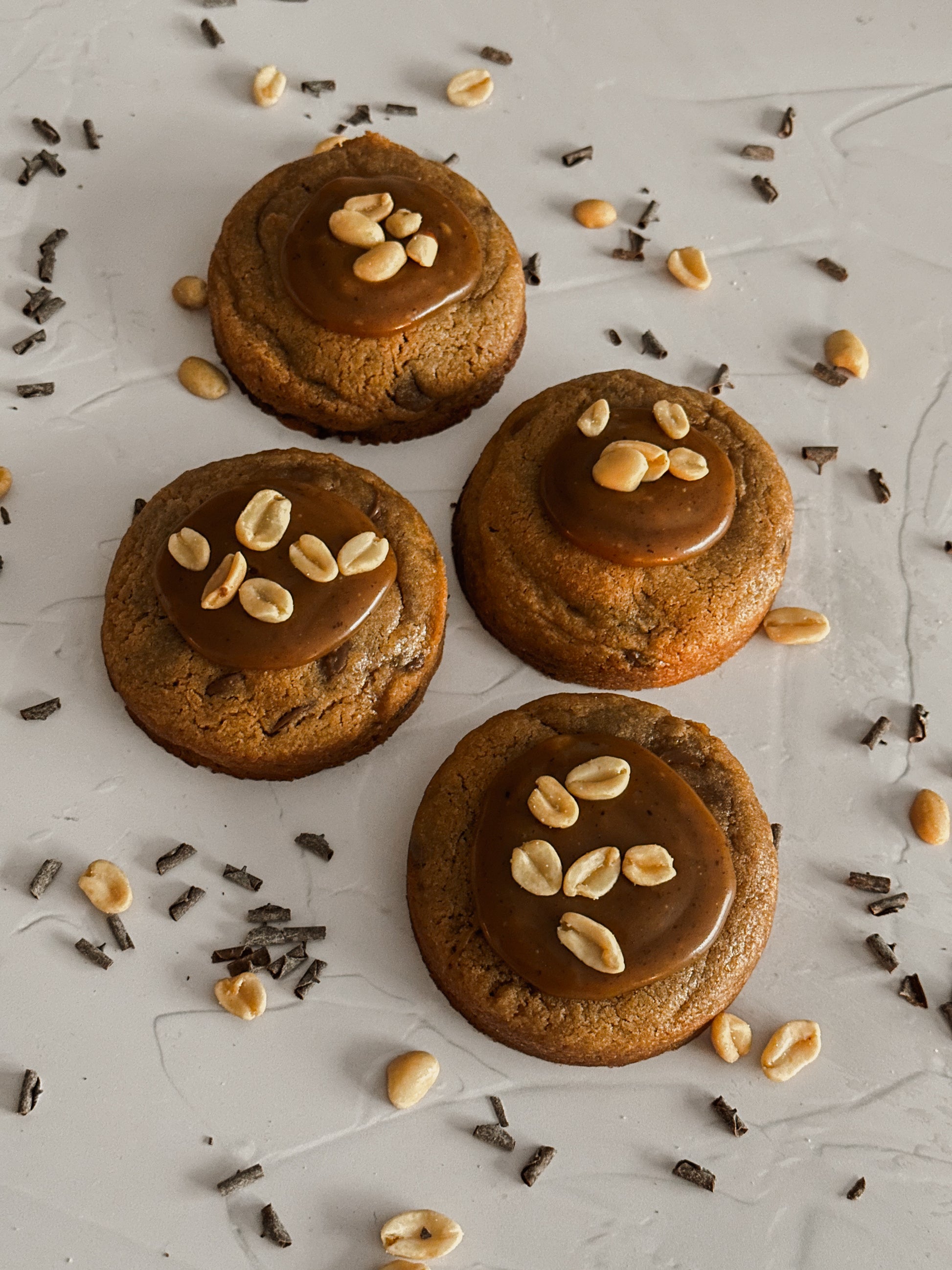 Notre cookie au Snickers est composé d'une pâte à cookie au praliné, de morceaux de chocolat au lait, d'un cœur au praliné, d'un caramel au beurre salé maison et de cacahuètes.